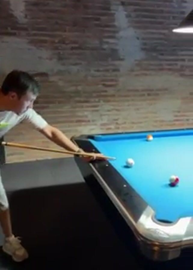 A man in a white shirt and grey shorts prepares to strike a white cue ball on a blue pool table with a wooden pool cue. The table has other balls on it, including two white balls, a red and white ball, a solid orange ball, and a solid blue ball. Two pendant lights hang above the table. A brick wall is behind the table.