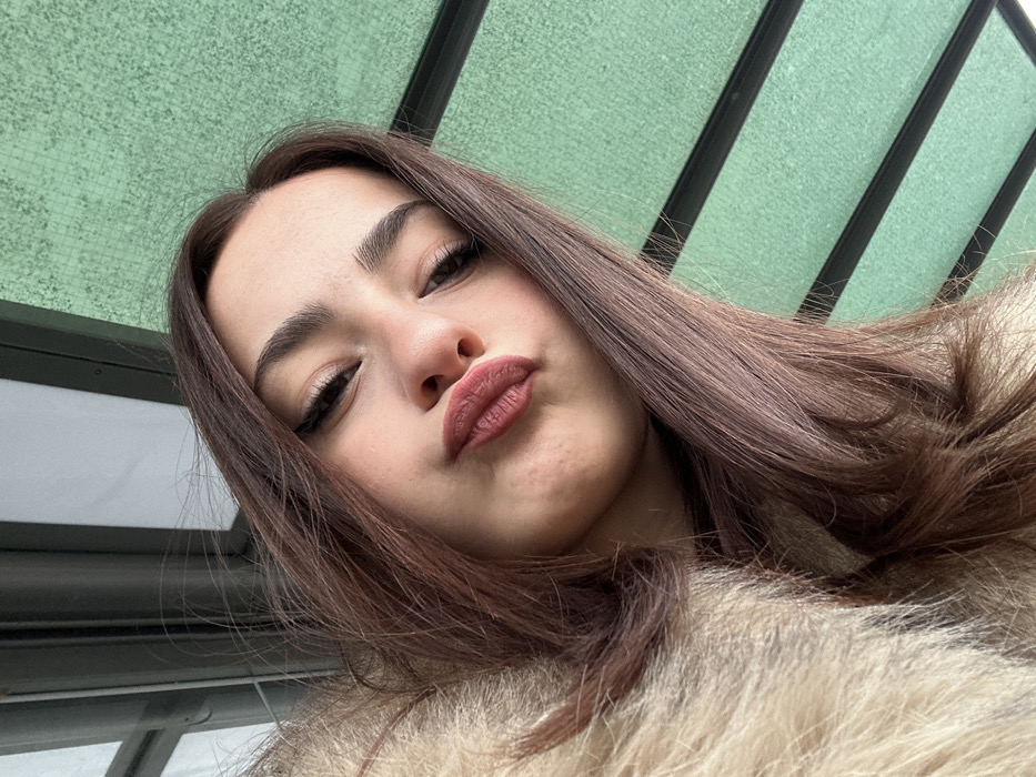 A close-up, low-angle image depicts a female in Bischheim, France. The subject, positioned centrally, has light brown to auburn hair framing her face. Her eyes are open, featuring prominent dark winged eyeliner. Her eyebrows are dark and well-defined, and her lips are pursed, colored with reddish-brown lipstick. Visible on the left side is a light brown, possibly faux fur, collar or hood of an outer garment. The background consists of a translucent green, textured overhead structure with dark horizontal support beams across the upper right, and an indistinct light-colored building element or window against a pale sky in the upper left. The subject's head is tilted slightly, and her gaze is directed towards the camera.