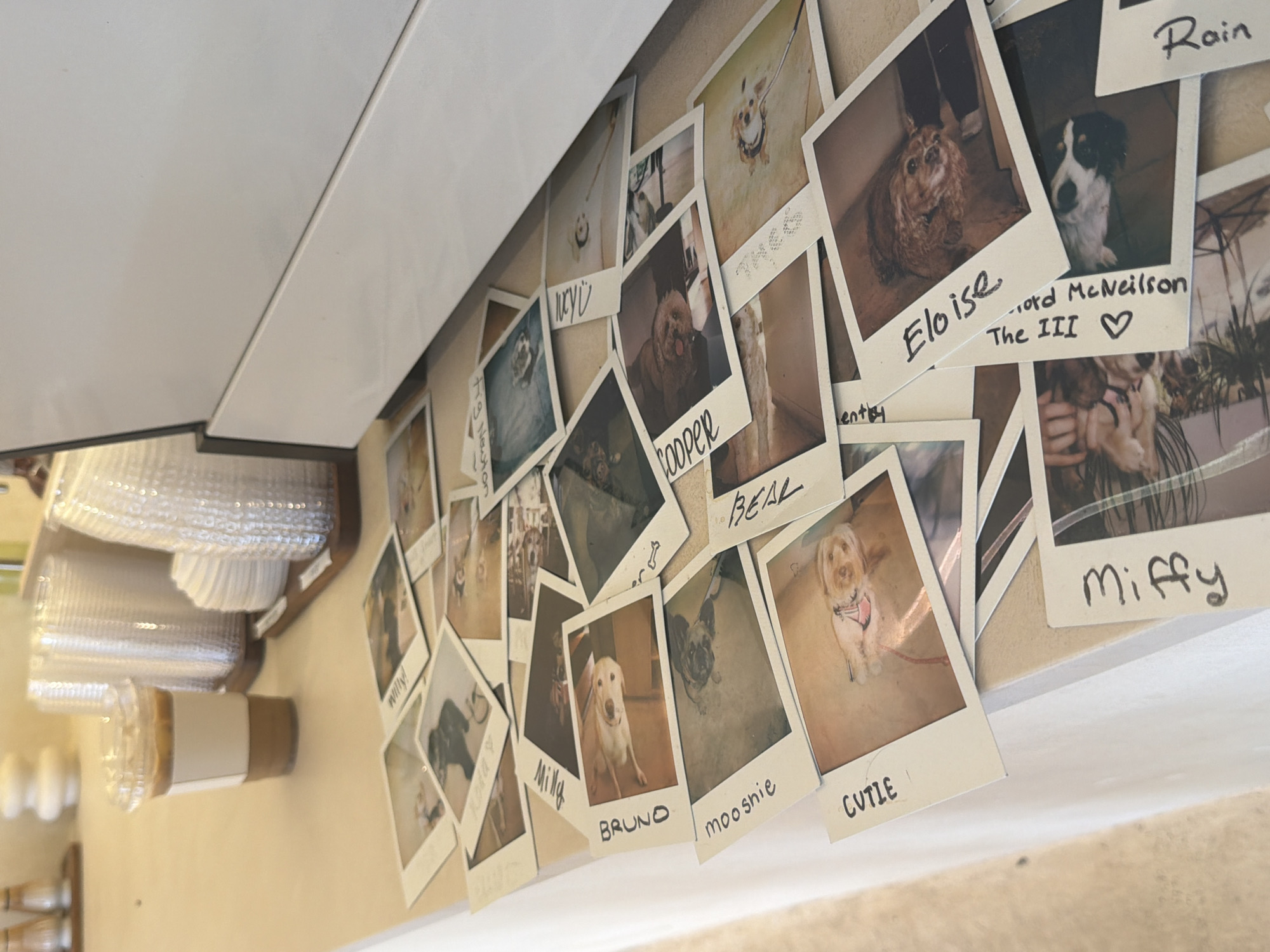 Here's a description of the image: The image shows a collection of Polaroid-style photos, mostly of dogs, adhered to a wall. The photos are arranged haphazardly, with handwritten names below each one: "Willy," "Newton," "Milly," "Rain," "Cooper," "BEAL," "entry," "Eloise," "Lord McNeilson the III," "Bruno," "moosnie," "CUTLE," and "Miffy." The photos appear to be displayed at a cafe or coffee shop, as evidenced by stacks of disposable coffee cups and lids visible on a shelf to the left. Based on the prevalence of dog photos and the general aesthetic, the location is likely a dog-friendly establishment. It is not possible to determine if the image was taken in Los Angeles without more information.