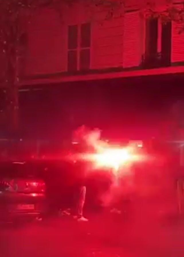 At night, a group of people stand on a street in front of a building. A red light illuminates the scene, seemingly originating from a flare held by one of the individuals. The flare emits a bright, intense glow and a cloud of smoke. The building behind them has closed shutters and appears to be a multi-story structure. A car is parked to the left of the group.