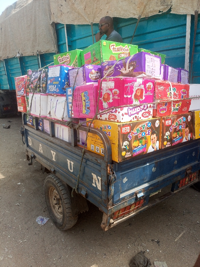 A blue "DAYUN" branded three-wheeled cargo vehicle is centrally positioned on a dusty, unpaved surface in Fagge C, Nigeria. The vehicle's cargo bed is heavily overloaded with a tall, unstable stack of various brightly colored cardboard boxes, secured with ropes. Visible brands on the boxes include "Faurecia Choco," "Sam Barto Doce," "Milk," "Chocolate," "Strawberry," and "Crumpy," indicating confectionery or snack products. One rear wheel of the cargo vehicle is visible, along with minor mudflap damage. In the background, partially obscured by the stacked cargo, a male individual with dark skin and a bald head, wearing glasses and a light-colored shirt, is observing the scene from what appears to be the cab of another, larger cargo truck covered by a beige tarp. The ground around the cargo vehicle contains sparse debris. The scene suggests a commercial loading or unloading activity.