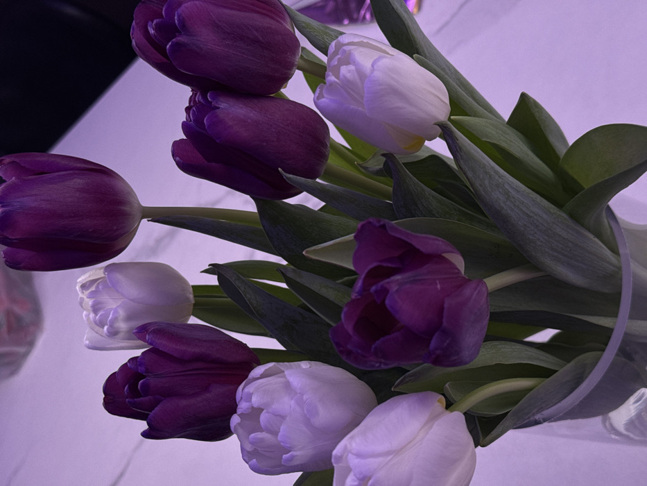 - "A bouquet of purple and white tulips fills the frame" by FM-v1KIi2, licensed under CC BY 4.0