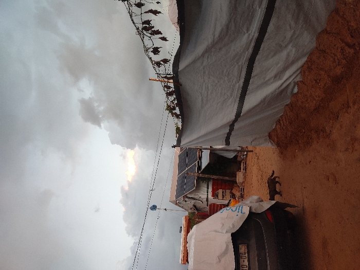 An outdoor scene in Khan Yunis, Palestinian Territory, captured under an overcast sky with patches of brighter light visible through grey clouds on the left horizon. The foreground features an unpaved, reddish-brown dirt path. To the left, a dark-colored sedan, partially covered by a white tarp bearing blue lettering, is parked; a license plate displaying "0-04" is visible. A dark-furred cat walks rightward across the dirt path, situated between the car and a temporary barrier on the right. This barrier consists of a large grey tarp erected vertically, supported at its base by a mound of reddish-brown soil. A dark horizontal stripe is present on the tarp. In the midground, behind the cat and car, multiple structures are visible. One prominent building features a pitched roof equipped with several solar panels. Its walls appear constructed from varied materials, including corrugated metal and possibly repurposed elements. Overhead, utility lines traverse the frame. A pole near the solar-paneled roof supports a blue object, possibly a small antenna or balloon. To the right, above the grey tarp, a horizontal line of dried leaves or dead vines is strung, possibly on barbed wire, extending across the upper midground. No individuals are visible.
