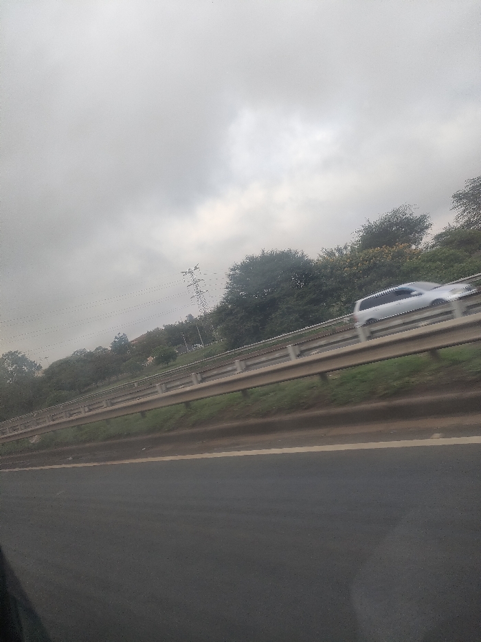 The image depicts a highway scene under an overcast sky, observed from a moving vehicle, located within Gatongora ward, Kenya