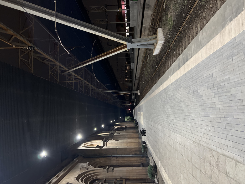 The image depicts a nighttime scene at the Yerevan Railway Station in Yerevan, Armenia. The view is along an empty, well-lit train platform, looking into the distance. On the left, a historic stone building with numerous arched window or door alcoves and decorative pilasters runs parallel to the platform. Several bright artificial lights are mounted on the building's facade, illuminating the paved surface. Small, manicured bushes are planted in beds along the base of this building. Dark-colored benches with distinctive, decorative metal supports are spaced along the platform near the building. The platform itself is paved with light grey rectangular pavers arranged in a linear pattern, with a lighter-colored warning stripe running along its edge closest to the tracks. To the right, at least two railway tracks are visible, laid on ballast. Overhead electrification structures, composed of metal gantries and supporting cables, span above the tracks. A prominent, V-shaped metal support pillar for these structures stands on the right side of the tracks in the mid-ground. Farther down the tracks, additional distant artificial lights are visible, and a single red signal light is discernible. The sky above is dark, indicating night. The entire scene is devoid of people or moving trains.
