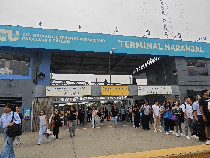 entrance to Terminal Naranjal, identified by a large sign. The sign also displays "Autoridad de Transporte Urbano Para Lima y Callao." Beneath the main signage are smaller signs indicating "Ingreso embarques 1-3" and "Ingreso embarques 4-6." People are seen entering and queuing near the entrance. The overall scene is set against a slightly overcast sky with a communications tower visible in the background.
