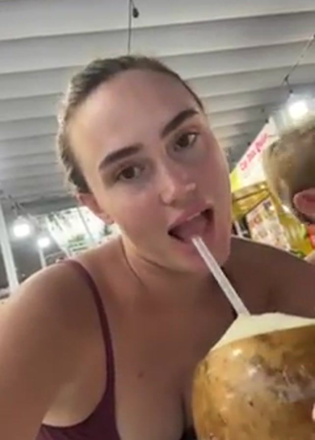 A woman in a maroon tank top is sitting at a table, holding a coconut with a straw and drinking from it