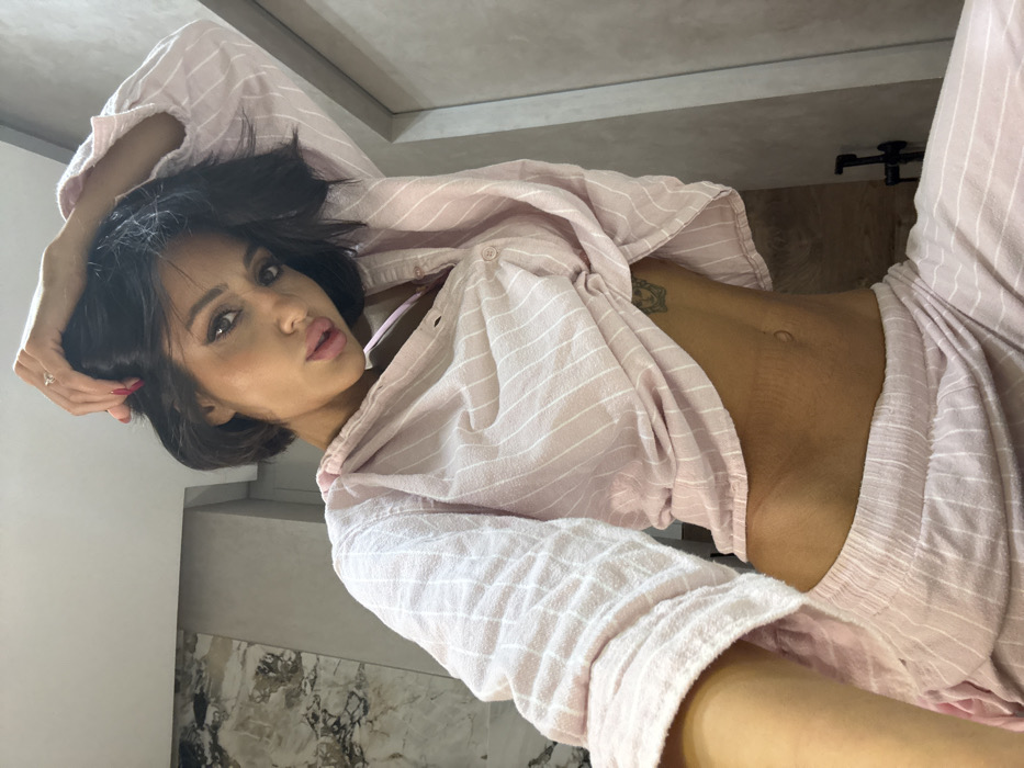 A woman with short dark hair poses in a low-angle shot. She is wearing a pink and white striped pajama set, unbuttoned to reveal her midriff. She has dark eyes and full lips, and her right hand is in her hair. A small tattoo is visible on her side. The background appears to be a modern bathroom with light-colored walls and cabinetry. A black fixture is mounted on the wall in the background.