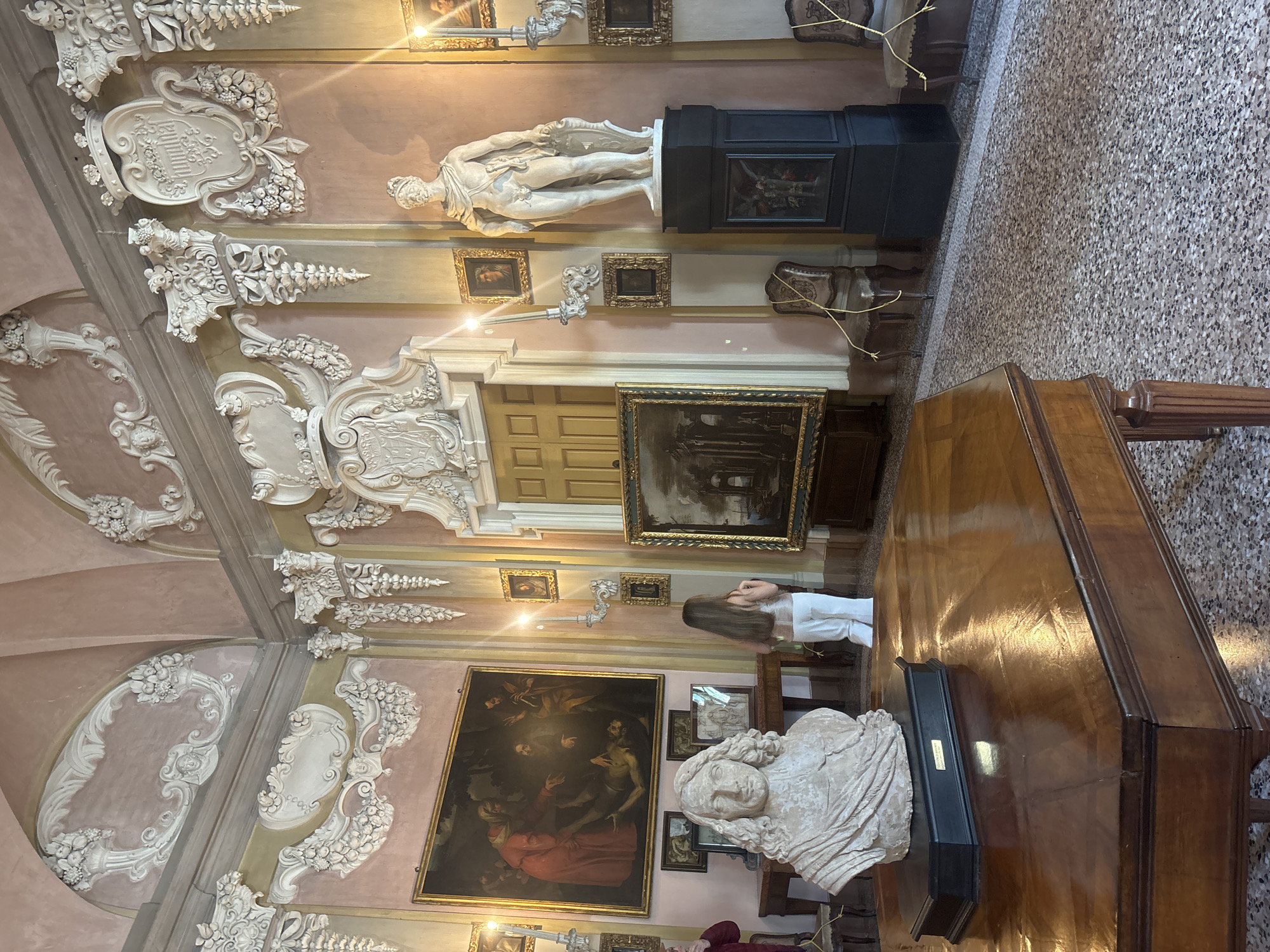 interior of Palazzo Borromeo, located in Carciano, Italy. The room is highly ornate with stucco embellishments on the walls and ceiling. Several framed paintings and sculptures, including a full-body statue and a bust, adorn the room. A large wooden piano occupies the foreground, reflecting light from the room. A person wearing white stands near the piano. The floor is a patterned mosaic.