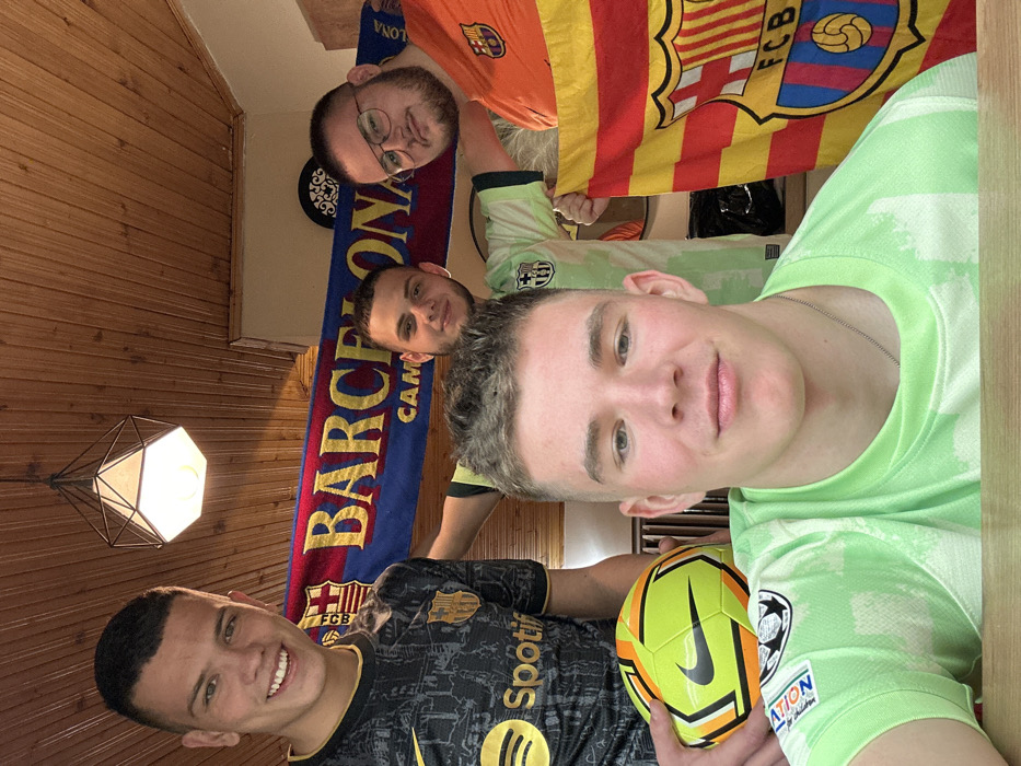 Four young adult males are depicted indoors, positioned to face the camera. The specific location within Haskovo, Bulgaria, cannot be determined from the visual evidence. In the foreground, a male with short, light brown hair and a neutral expression looks directly at the camera. He wears a light green long-sleeved shirt featuring a distressed white pattern and a thin necklace. Behind him, from left to right: A male with short, dark hair smiles, wearing a dark grey FC Barcelona jersey with a "Spotify" sponsor logo. He holds a yellow/lime green and black Nike football with orange accents in his left hand. Adjacent to him, a male with short, dark hair and light facial stubble smiles. He wears a light green FC Barcelona jersey. His right arm is extended towards the male on the far right. On the far right, a male with short, dark hair, a beard, and eyeglasses smiles. He wears an orange FC Barcelona jersey and holds a red and yellow striped flag featuring the FC Barcelona crest in his right hand. A blue banner with "BARCELONA" in yellow text and the FC Barcelona crest is stretched across the upper background, behind the three standing individuals. The interior features light brown wooden paneling on the ceiling and walls. A geometric-shaped, dark-colored ceiling lamp with a white diffuser is visible in the upper center. A light-colored wooden surface, possibly a table, is present in the lower foreground.