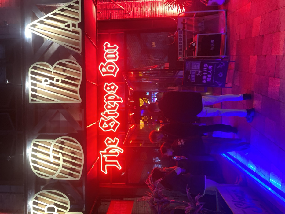 The image depicts a nighttime street scene outside "The Steps Bar" in the city of Chongqing High-tech Zone, China