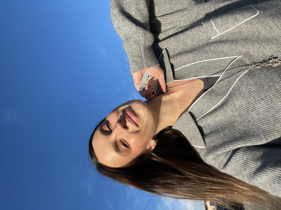 A female individual is depicted outdoors in a sunlit environment in Mojanovići, Montenegro, captured in a selfie perspective. She has long, dark brown hair, a fair complexion with blush, and a smiling expression with her head slightly tilted. She wears small gold hoop earrings, a thin silver necklace with a circular pendant, and a longer silver chain necklace featuring multiple charms. Her attire consists of a grey knitted long-sleeved top with a collar, white piping, and a visible darker inner layer. Her right hand, adorned with red nail polish, holds a small, white rectangular product tag or label against her neck. The background features a clear blue sky with minimal cloud cover, and faint outlines of buildings and a utility wire are visible on the left side of the frame.