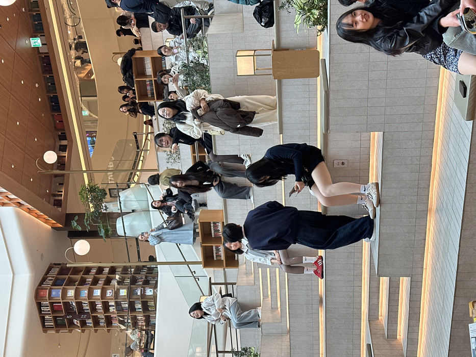 The image displays an expansive, multi-level indoor public space, identified as Starfield Suwon in Suwon-si, South Korea. The environment is characterized by large, terraced seating areas constructed from light grey square tiles, ascending numerous levels, with integrated linear lighting along some steps. On the left, a tall, multi-story cylindrical bookshelf structure, filled with books, extends upwards. The upper levels feature wooden ceilings and additional bookshelves. Illumination is provided by spherical white lamps on brass-colored poles and a square, illuminated lantern-style lamp on a lower terrace. Potted green plants are strategically placed on various levels. Approximately twenty-five individuals, predominantly young adults of East Asian descent, are distributed across the terraced seating. Actions and interactions include: A woman in a light blue coat stands on a mid-level terrace, holding a smartphone to capture an image or video. Several individuals are engaged in conversation, with some exhibiting smiles and laughter; for example, a woman in a dark jacket on a mid-level terrace is seen gesturing while laughing, and another woman in a light-colored jumpsuit or dress also appears to be smiling broadly. Other individuals are seated, focused on their smartphones, such as a woman in black shorts on a lower terrace. A person in a navy top and dark wide-leg pants stands with their back to the camera, observing the scene. Personal items, including jackets and bags, are resting on the seating surfaces. The overall atmosphere suggests a relaxed social or leisure setting within a modern architectural design.