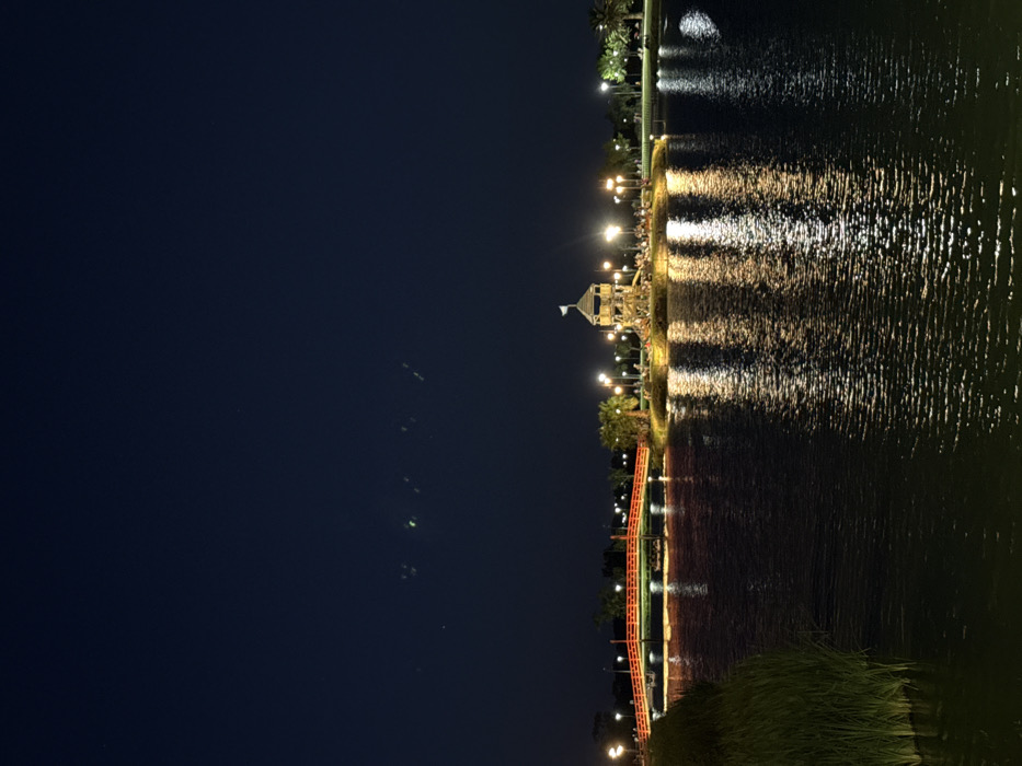 A tranquil nighttime scene unfolds with a dark sky contrasting with the illuminated shoreline. Reflective water shimmers with light from buildings and streetlights lining the edge. A prominent tower structure stands out amidst the glow. A red bridge stretches across the water, adding a vibrant color contrast to the scene. The overall composition suggests a peaceful urban or suburban park at night.