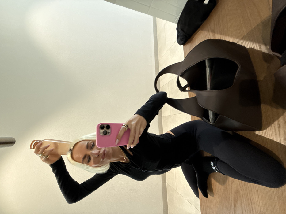 A blonde woman in a black long-sleeved zip-up top and leggings poses for a mirror selfie, holding a pink phone