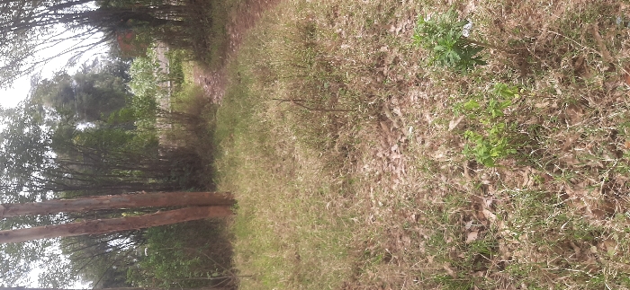 A narrow dirt path winds through a grassy area flanked by trees. The grass is dry and brown in places, mixed with patches of green. The trees line the left side of the path, casting shadows. The path appears to lead into a wooded area. There is an overgrown look to the scene.