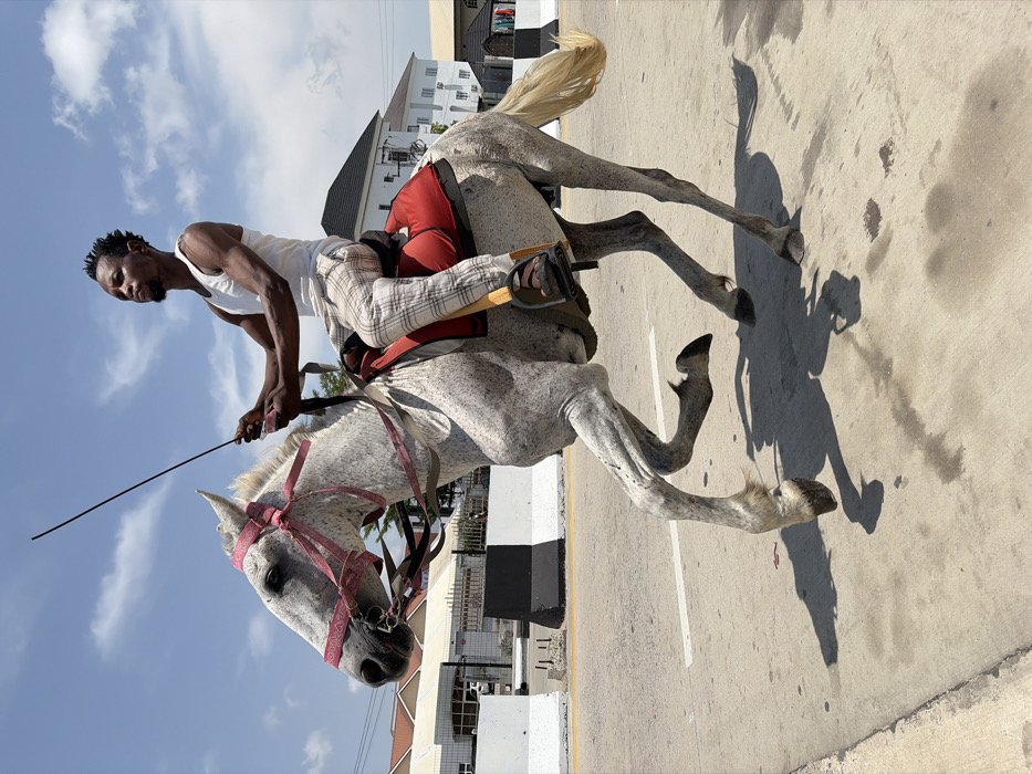 - "An adult male rides a dappled grey horse on a paved road in Igboefon, Nigeria, under a blue sky with scattered white clouds" by FM-rkm0j2, licensed under CC BY 4.0