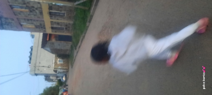 The image presents a street scene in Nairobi, Kenya, under low-light conditions, consistent with dawn or dusk. A child, rendered with significant motion blur, runs from right to left across the center of the frame, facing away from the viewer. The child wears a white long-sleeved top and white pants, with pink footwear visible on both feet. The foreground consists of a dark-toned road. To the right of the road, a narrow sidewalk borders a series of buildings. The closest building is a multi-story structure composed of dark, possibly stone or brick, material with light-colored horizontal bands and window frames. Behind it, a lighter-colored, multi-story building features a flat roof with visible dark installations, possibly water tanks. Utility lines are visible against the pale blue-grey sky in the upper portion of the image. In the distant background on the left, blurred human figures and a light-colored vehicle are discernible. The text overlay "police kombo❤💕" is present in the lower-left corner of the image.