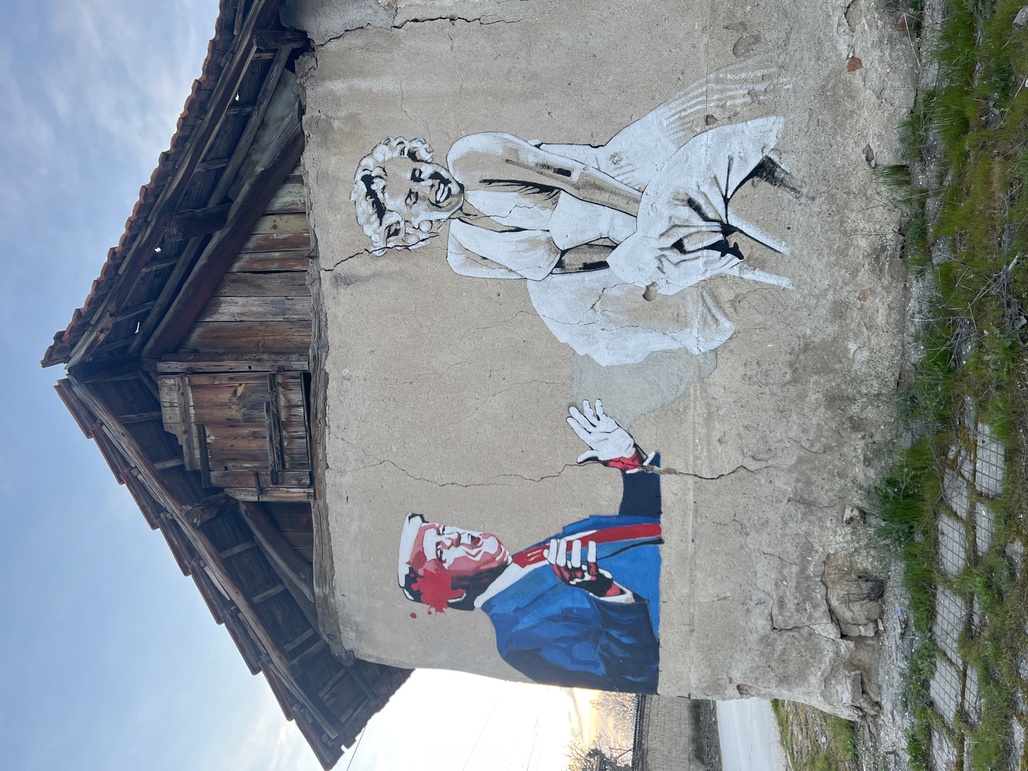 A horizontal shot shows a building exterior in Staro Zhelezare, Bulgaria. The wall is painted with two distinct images. The upper image depicts Marilyn Monroe in her iconic pose from "The Seven Year Itch," rendered in a white and grey color palette. Below Monroe is an image of Donald Trump in a blue suit, red tie, with red marks on his face, possibly suggesting blood. He appears to be raising his hand. The building wall is cracked and aged. Adjacent to the wall is a rustic wooden roof and structure. Vegetation grows near the base of the wall. A road is visible in the distance. The sky is light blue. The overall scene suggests a blend of street art and dilapidated infrastructure.