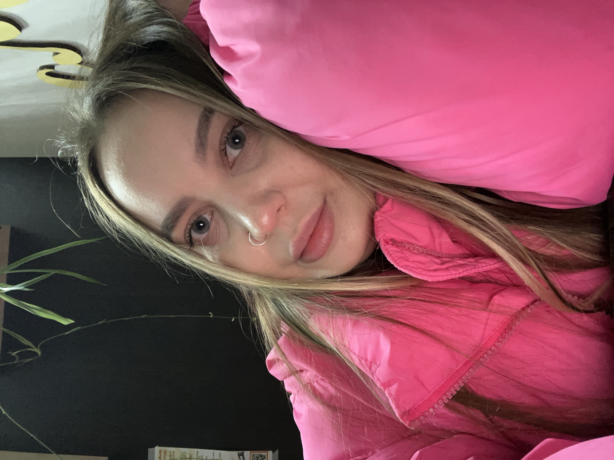 The image displays a close-up, eye-level indoor portrait of a single female subject. She has long, straight, light-blonde hair, light-colored eyes, and a silver hoop nose ring in her left nostril. She is wearing a bright, neon pink puffer jacket, which exhibits a slightly crinkled texture and visible zippers. Her right side is pressed against a large, puffy, neon pink surface, consistent in color and material with her jacket, implying she is resting her head on it. Her gaze is directed straight at the camera, and her lips are slightly parted. In the background, on the subject's left, a dark, likely black, wall is visible. A light-colored paper document with partially visible Cyrillic text is affixed to this wall. Above it, a green plant with long, thin leaves and tendrils hangs down from an overhead light-colored wooden beam. To the subject's right, a light-colored, possibly off-white, wall is present, featuring a prominent yellow, stylized decorative element that resembles a musical note. The lighting is indicative of an interior setting. The specific location within the city of Chaikovsky, Russia, cannot be determined from the visual information provided.