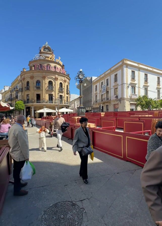 The scene captures a vibrant outdoor market on a sunny day. Pedestrians stroll along a cobblestone street lined with red barriers. On one side, tables and umbrellas mark outdoor cafes buzzing with activity. In the background, a grand building with a distinctive dome stands out against the clear blue sky, next to a white building with multiple windows. The focus is slightly blurred, giving the impression of a bustling, lively urban environment.