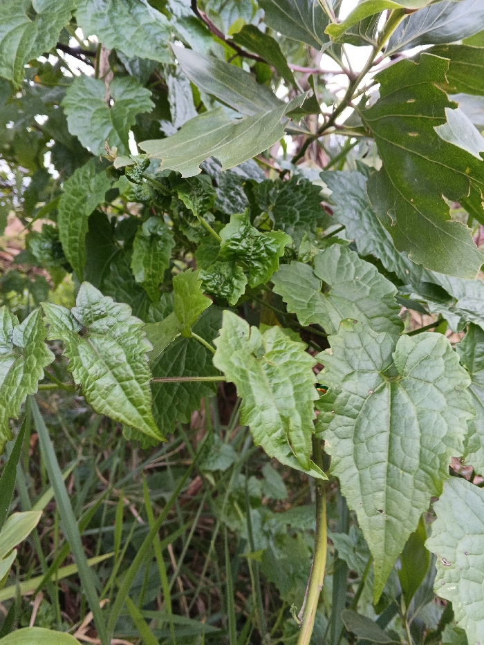 This image presents a close-up, vertical composition of dense, mixed green foliage, situated in Chengdu, China. The foreground is filled with various plant leaves, primarily showcasing heart-shaped to ovate forms with prominent venation and serrated or crenate margins. Many of these leaves display a textured, somewhat wrinkled surface. Lighter green, smaller, and more crinkled leaves, indicative of new growth, are also visible. Towards the upper right, a plant with elongated, lanceolate leaves is present, some exhibiting small holes and irregular edges consistent with insect damage. Faintly visible stems, varying in color from reddish-brown to greenish-brown, interweave through the leaf clusters. The background consists of blurred green and earthy-toned vegetation, suggesting a natural or uncultivated outdoor environment. No people, animals, man-made objects, or specific actions are depicted in the frame. The lighting is diffused and natural, indicating an overcast condition or a shaded area.
