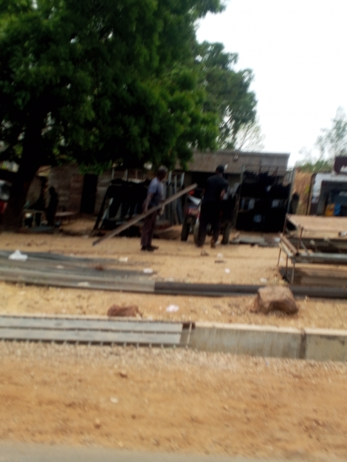 The image depicts an outdoor scene in the city of Adankolo, Nigeria, characterized by a mix of unpaved ground, structures, and individuals engaged in activity