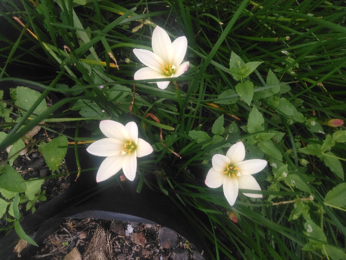The image displays a close-up, top-down view of three white flowering plants, specifically identified as *Zephyranthes candida* or a similar species, situated in a natural environment. Each flower possesses six distinct white petals and a prominent yellow-green central reproductive structure. They are arranged in a loose triangular pattern within the frame. The flowers are surrounded by a dense growth of various green foliage. This includes numerous slender, bright green, grass-like leaves and several broader, smaller green leaves. A few plant buds, appearing reddish-pink, are visible among the foliage, particularly towards the bottom. Small water droplets are visible on some of the leaves, indicating recent moisture, possibly dew or rain. In the upper left portion of the image, a segment of a black, flexible plastic planter or grow bag is visible, containing dark soil or mulch with scattered organic debris. The overall ground surface beneath the plants is dark and organic. The lighting appears to be natural and diffused, suggesting an outdoor setting. No people, animals, or artificial structures other than the planter are visible. The specific location in the city of Santa Cruz, Venezuela, cannot be determined from the visual content of the image.
