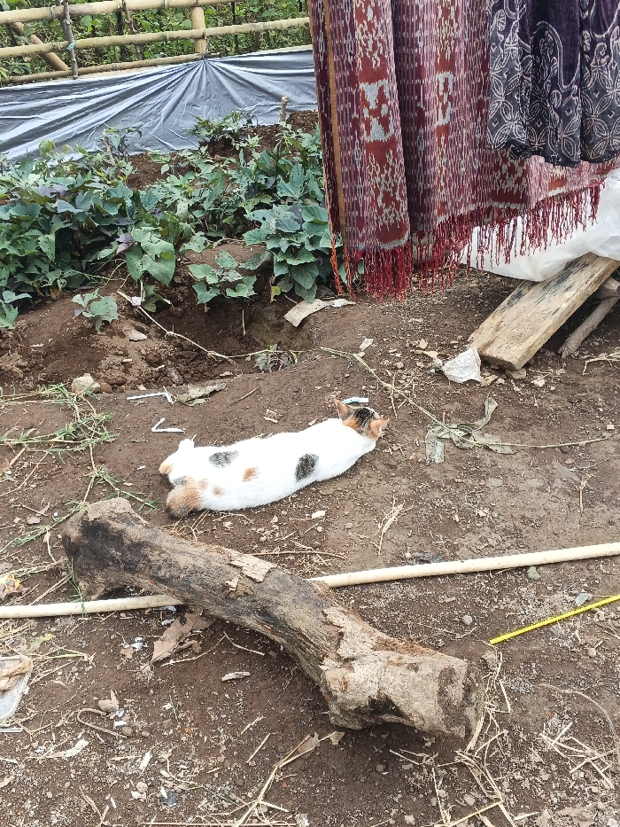 A cat sprawls on the ground amidst foliage, dirt, and fallen debris. Its white fur is marked with brown and black spots. Above the cat, patterned textiles hang, seemingly drying in the open air. Further back, a green plant bed with a gray plastic sheet backdrop is visible. A large piece of wood lies in the foreground, near the cat's head.