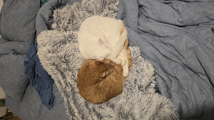 The scene depicts an interior setting, specifically a bed, within the city of Unknown, Unknown. The bed is covered with blue-gray patterned bedding and pillows, featuring a light-colored leaf or feather design. A crumpled blue garment rests on the bedding near the pillows. Two domestic cats are observed sleeping on a light gray, shaggy blanket draped over the bed. One cat is orange/ginger-colored, curled tightly into a ball, resting against the second cat. The second cat is white, also curled tightly, with light pink ears, and is snuggled against the orange cat. Both cats appear to be in a state of rest or sleep, positioned in close contact.