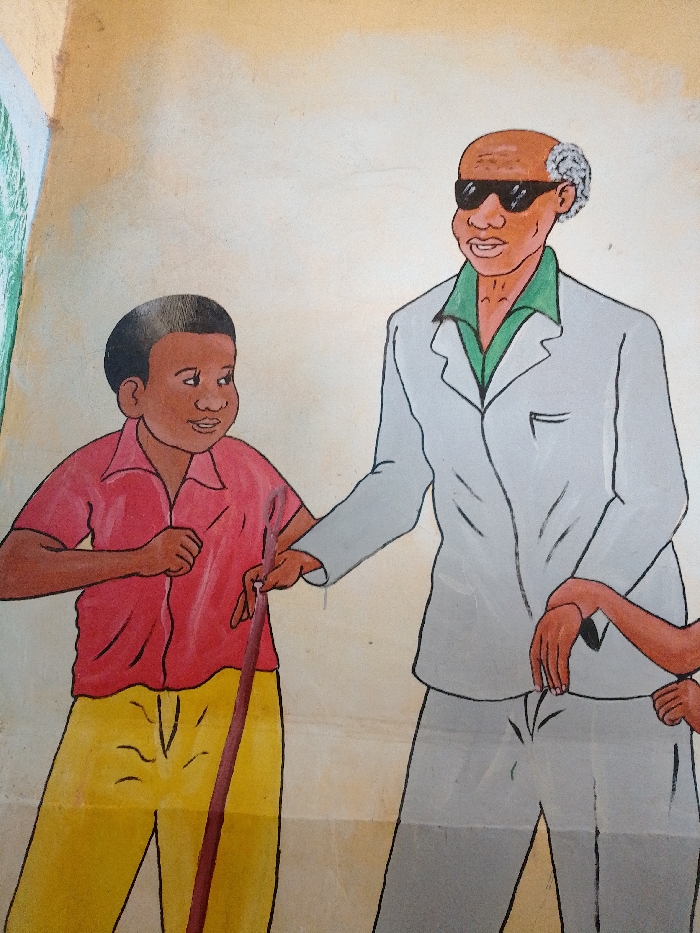 A painting depicts a boy assisting an older, visually impaired man