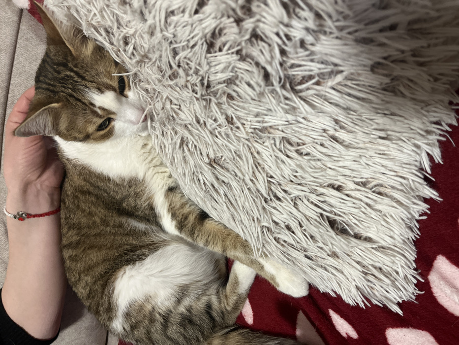 - "A domestic short-haired cat, displaying a brown and grey tabby coat with extensive white markings on its face, chest, belly, and paws, is observed resting indoors in Varna, Bulgaria" by FM-w6tRF2, licensed under CC BY 4.0