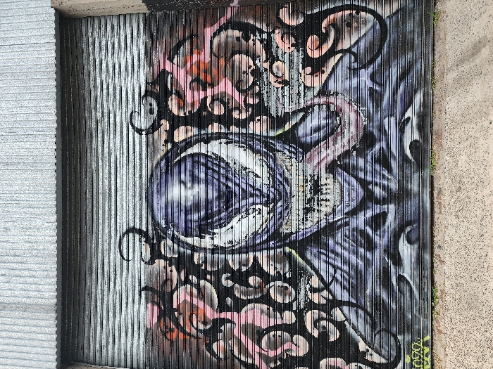 A corrugated metal wall displays vibrant graffiti art. A large, stylized eye dominates the composition, rendered in shades of purple, black, and white. Abstract swirls and tendrils, outlined in black, surround the eye, creating a sense of dynamic movement. Hints of pink and orange add color to the complex design. The artwork contrasts sharply with the plain corrugated metal on the left. A concrete wall abuts the right side of the graffiti.