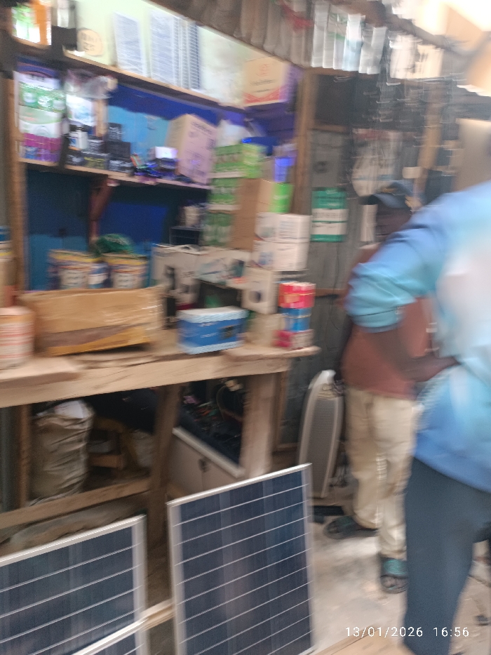 A cluttered shop interior shows shelves stocked with boxes, cans, and electrical components. Solar panels are prominently displayed in the foreground. Two men are visible; one in a red shirt and tan pants stands near a fan, while the other wears a blue and white shirt. The lighting is somewhat dim and the scene appears disorganized. A date stamp in the lower right corner indicates "13/01/2026 16:56".