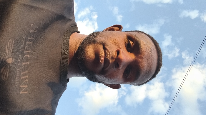 A man with dark skin and a short beard gazes upward at the camera against a backdrop of a blue sky with scattered clouds