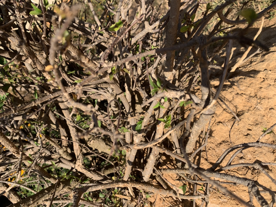 - "The scene depicts a dense, intricate network of dry, brown, woody branches from a shrub or tree, predominantly leafless, with scattered small green sprouts and nascent leaves emerging throughout" by FM-1vloc2, licensed under CC BY 4.0