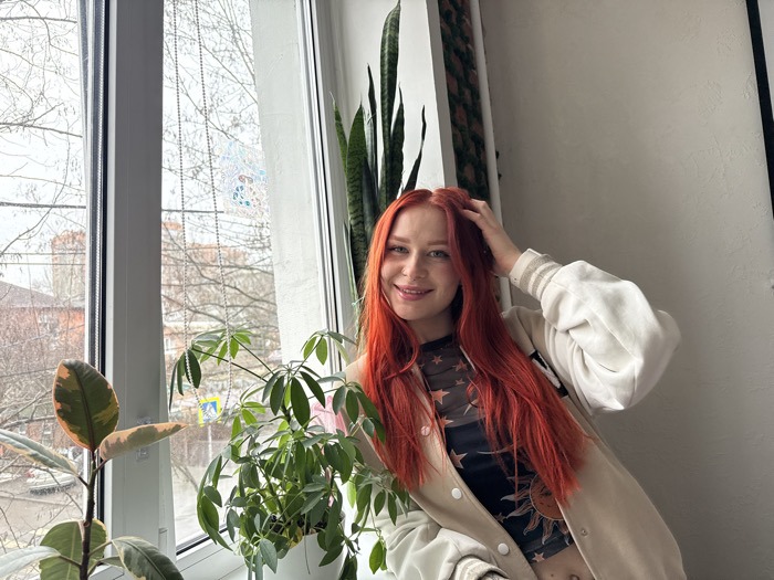 female individual indoors, positioned at an angle beside a large window in what is identified as Rostov-on-Don, Russia. The woman has long, vibrant red hair and a light complexion, with a discreet nose piercing. She is smiling at the viewer, with her left hand lightly touching the back of her head. She is dressed in a dark, sheer top adorned with celestial patterns, partially covered by a light-colored, possibly off-white, bomber jacket with striped cuffs. Her midriff is partially exposed. On the white windowsill, two potted plants are visible: one on the left with large, variegated green and cream leaves, and another in a white pot with multiple smaller, green leaves. A tall, slender green plant is situated against the interior wall to the right of the window. A white beaded chain hangs vertically in the window, and a translucent decorative sticker, possibly a snowflake pattern, is affixed to an upper pane. Through the window, an exterior scene under an overcast sky is visible. Bare deciduous trees dominate the view, suggesting a dormant season. A street is discernible, featuring a yellow, diamond-shaped pedestrian crossing sign. Utility poles and overhead wires are also present. Distant building rooftops complete the urban or suburban outdoor environment.