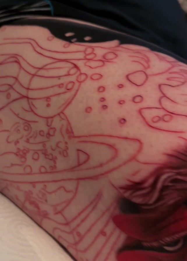 person's leg with a tattoo being applied. The leg has a faint red outline of a design, which appears to include planets and other circular shapes. A tattoo artist has already partially completed a tattoo on the leg featuring a face with red and white stripes, with black stripes emanating from the face. The leg rests on a white cloth surface. The person wearing the shorts is not visible. The focus remains on the leg and tattoo.