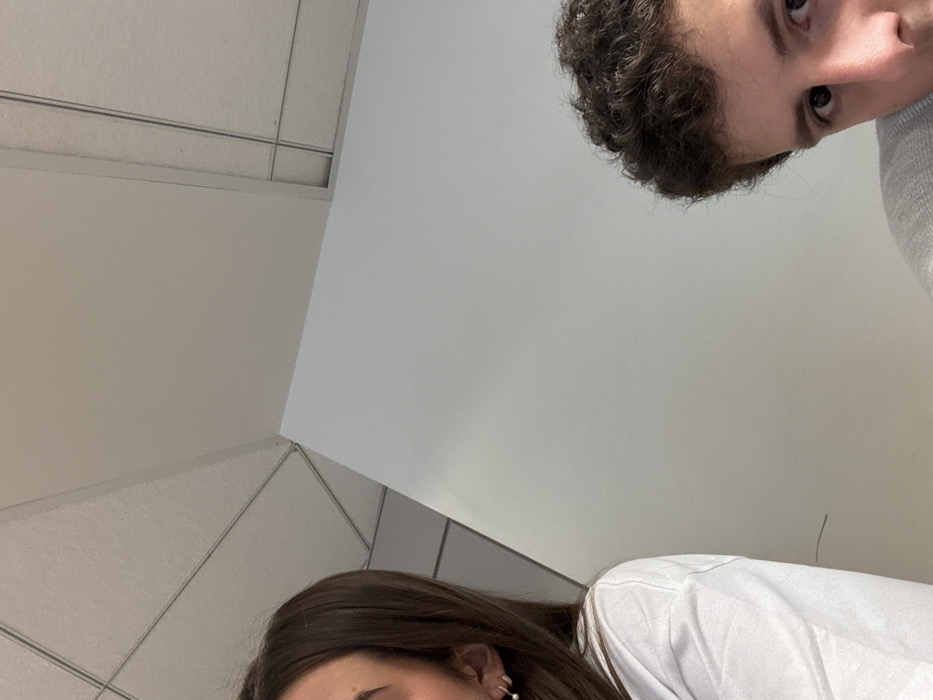 This image captures two individuals within an indoor environment, likely a commercial or institutional building in Wellesley, United States. However, the precise location within Wellesley is not discernible from the provided visual information. The scene is depicted from a low angle, looking upwards. On the left side, a female subject is partially visible, showing long, straight, dark brown hair and a portion of a white long-sleeved garment. Her right ear is visible, adorned with two small, silver-toned hoop earrings. Her head is angled upwards and to the right. On the right side, a male subject is partially visible, displaying short, curly, dark brown hair and a light grey, textured sweater. His right eye, part of his nose, and cheek are visible, and his gaze is directed towards the camera's perspective. The upper portion of the image shows a white acoustical tile drop ceiling with a visible metal grid system. Below the ceiling, light grey or off-white walls form an interior corner. The environment suggests artificial illumination, consistent with an indoor setting. No specific actions or direct interactions between the subjects are evident; they appear to be stationary within the shared space.