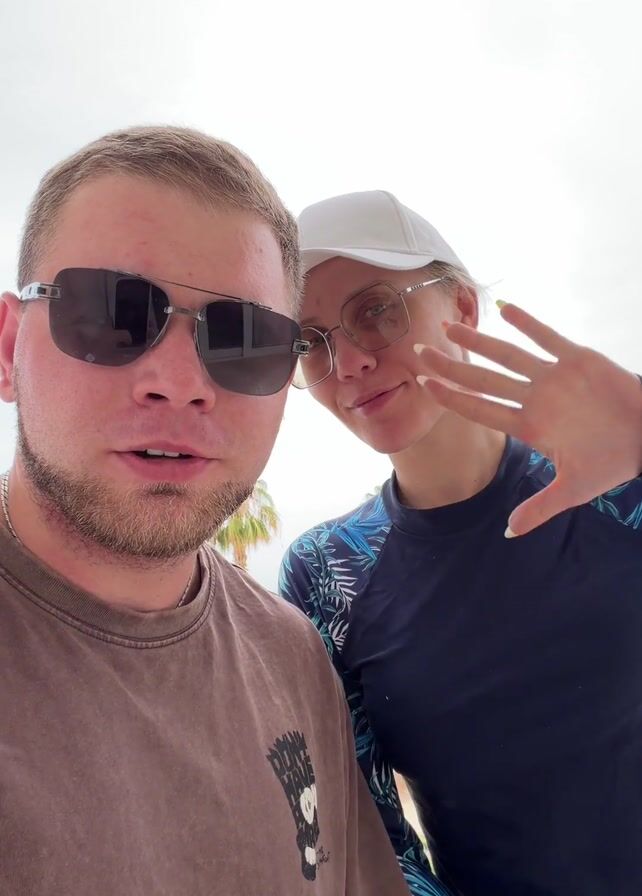 A low-angle, medium shot shows two people standing close together, looking at the camera. The person on the left is a man with short blond hair, a beard, and sunglasses. He wears a brown t-shirt with a graphic print. The person on the right is a woman with blond hair wearing glasses and a white baseball cap. She wears a dark blue long-sleeved shirt with a tropical print. Both people are waving and smiling at the camera. The man has a tattoo on his left arm. The background is blurry but appears to be a beach with palm trees and a cloudy sky. The man speaks into the camera, greeting someone.