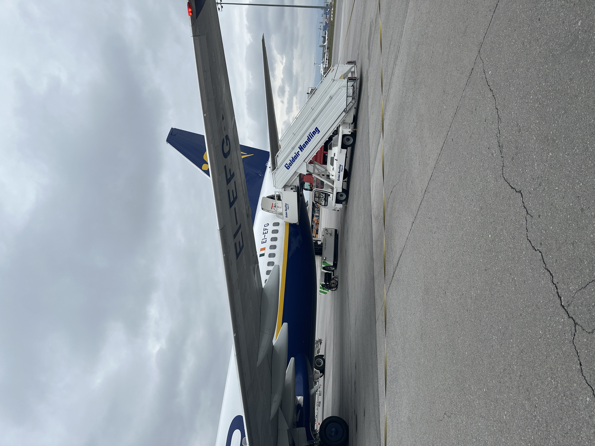 tail section of a Ryanair airplane, registration EI-EFG, parked on the tarmac. It is adjacent to a Goldair Handling passenger boarding stairs. The background shows a cloudy sky. The location is most likely Sofia Airport in Sofia, Bulgaria, given that Goldair Handling operates there. The airplane is stationary, and there are no people visible. The focus of the image is the airplane and the boarding stairs.