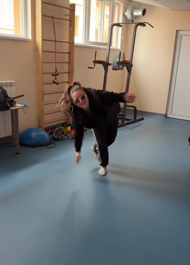 A person wearing black clothing, black vest, and white shoes attempts a handstand in a room with blue flooring. The person is in the middle of the room, with hands on the floor and legs extended upwards. Behind the person is a wooden ladder attached to the wall, a blue exercise ball, and a black weightlifting machine. There are windows on the wall to the left, and a door on the right. After an unsuccessful handstand attempt, the person stands up, smiles, and adjusts their glasses.
