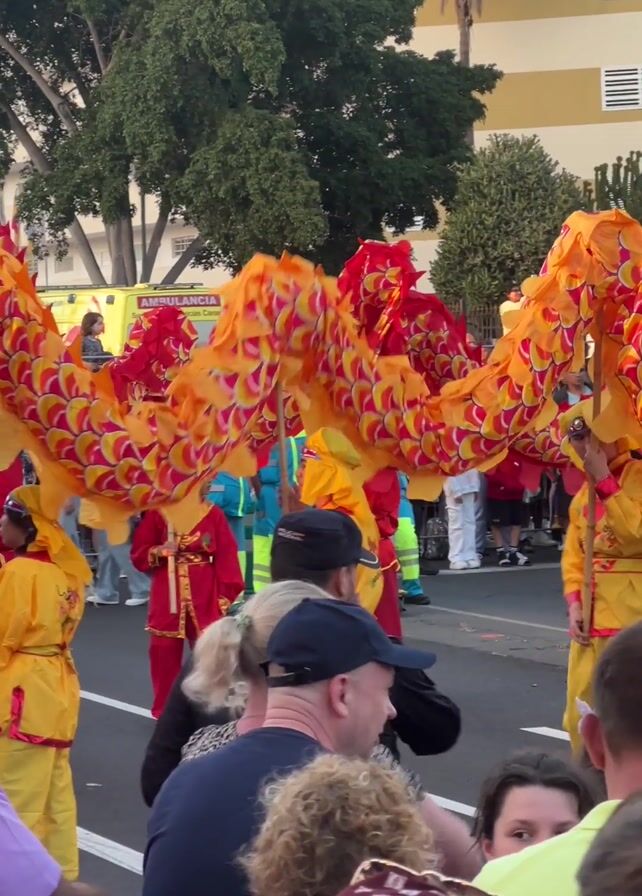 This video shows a Chinese dragon parade on a street. Several people in yellow and red traditional Chinese costumes are carrying a long, colorful dragon puppet. The dragon is made of fabric in shades of yellow, orange, and red, with a pattern of scales. The parade moves along a street lined with buildings and a crowd of spectators. Some of the crowd are taking photos with their phones. In the background, there is an ambulance and a windmill.