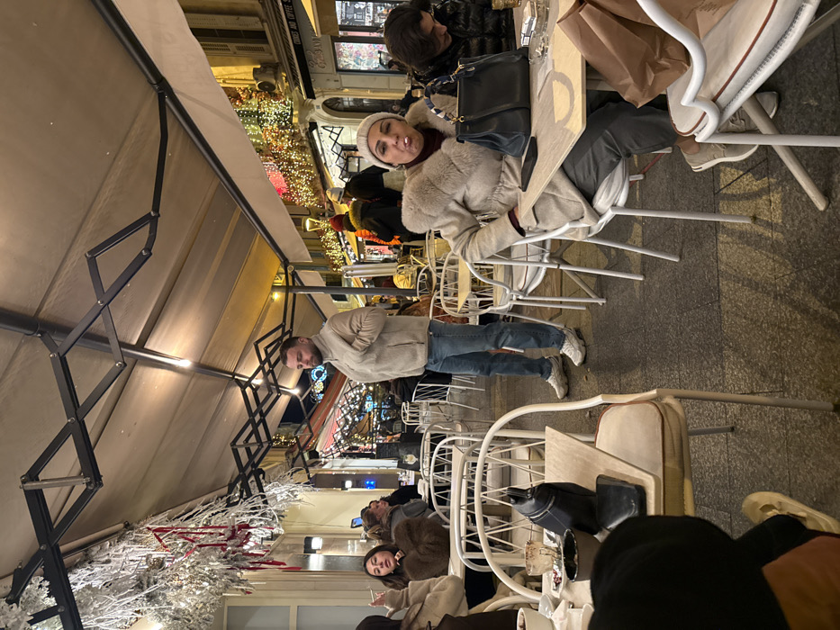 An outdoor restaurant scene at night shows people seated at tables under a covered area. String lights decorate the buildings. A woman in a white coat and hat sits at a table with a black purse. A man stands nearby in a light-colored jacket and jeans. Other people are seated at adjacent tables. The overall ambiance suggests a festive and social environment.