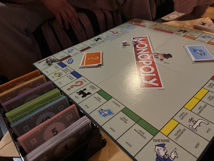 - "An overhead, close-up photograph depicts a Monopoly board game in progress or recently set up on a light-colored wooden table in Gerakas Municipal Unit, Greece" by FM-KQsxp1, licensed under CC BY 4.0