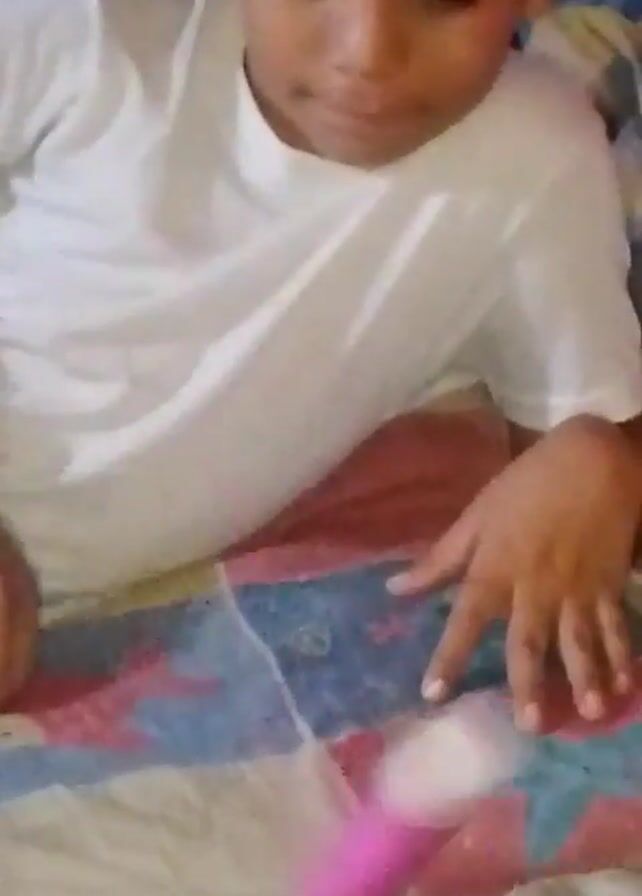 A young boy is sitting cross-legged on a bed with a multi-colored blanket. He is wearing a white t-shirt and looking down. The boy is holding a small pink and white bottle in his left hand and touching the blanket with his right hand.