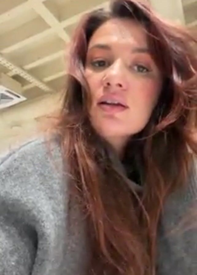 A person with long reddish-brown hair and wearing a gray sweater is looking at the camera. The person smiles, then purses their lips and winks at the camera. The background is a ceiling with white and gray beams. The overall lighting is dim.
