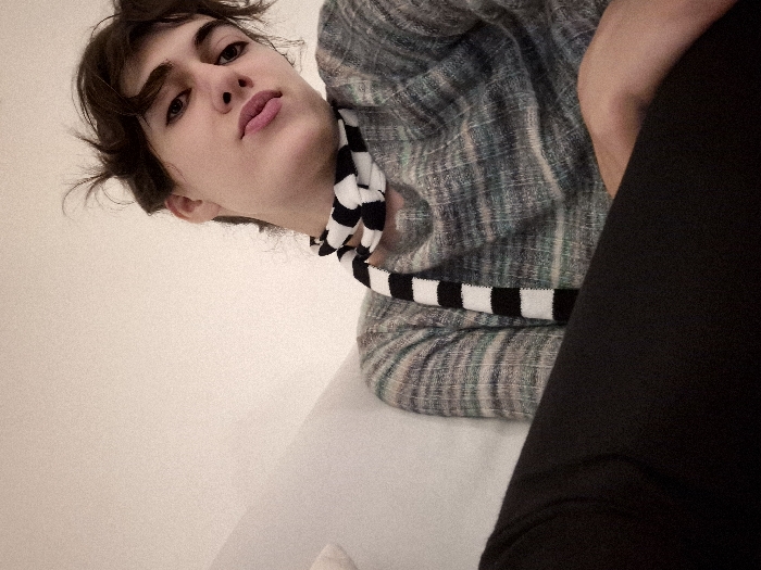 A low-angle, close-up indoor portrait displays a young adult, gender indeterminate, with medium-length dark wavy hair, dark eyes, and light skin, situated within the city of Paris, France. The individual is positioned against an undecorated, light-colored wall or soft furnishing. They are attired in a long-sleeved knitted sweater with variegated grey, blue, and green horizontal stripes, complemented by a black and white striped scarf tied loosely around the neck. Dark-colored trousers are visible in the lower left foreground. The subject's head is slightly tilted, and their lips are subtly pursed, with their gaze directed straight into the camera. A portion of their left arm is visible, resting on their lap.