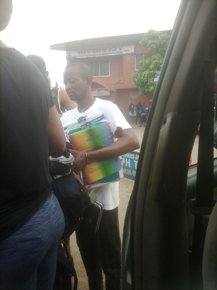 A man stands, holding a stack of colorful folders. He wears a white t-shirt and dark pants, with a dark bag slung over his shoulder. Another person is partially visible in the foreground. A sign reading "RIVERSJOY" is on a building in the background. The view is from inside a car, with the car's door visible on the right. Other people are visible in the distance near the building.