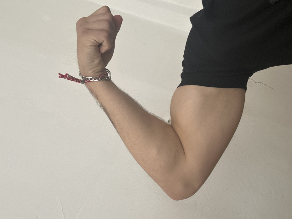 The scene is situated in the city of Pravets, Bulgaria. The image presents a close-up, horizontal view of a fair-skinned human right arm flexing a bicep against a plain, light-colored wall. The arm is bent at the elbow, forming an approximate 90-degree angle, with the bicep prominently contracted. The forearm extends to a clenched fist positioned on the right side of the frame. Light hair growth is visible along the forearm. A segment of a black short-sleeved garment is visible around the upper arm. The wrist is adorned with two bracelets: a silver-toned metal chain-link bracelet and a red and white braided cord bracelet, knotted at the top. The background wall is uniformly lit, showing minor surface texture.